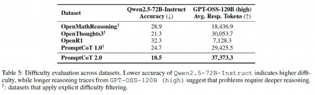 1、更难:在零微调评测下(例如直接使用强指令模型解题),PromptCoT 2.0 表现为更低的即刻正确率和更高的推理 token 消耗,说明这些题目更能"咬合推理",有效挖掘模型潜在的推理上限。