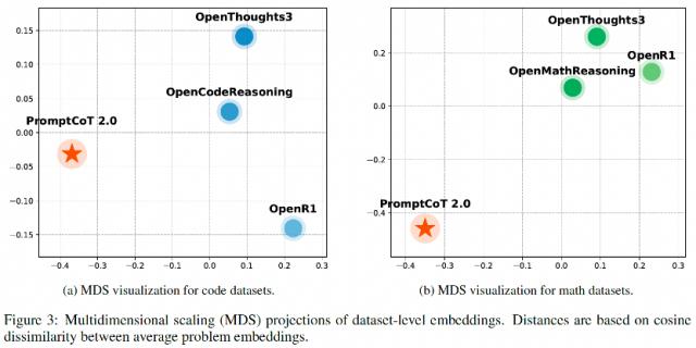 2、更具差异化:基于 all-MiniLM-L6-v2 的嵌入均值与余弦距离,并通过 MDS 映射到二维空间后,PromptCoT 2.0 的数据点与现有开源题集(OpenMathReasoning、OpenThoughts3、OpenR1 等)形成了独立分簇,而后者之间分布更为接近。