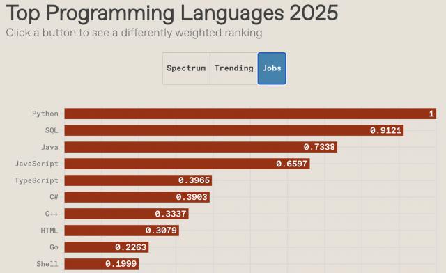 不过,SQL 的处境依然比 JavaScript 安全得多。即便不再耀眼,它仍是极具价值的就业技能,和 Python 的差距并不大。