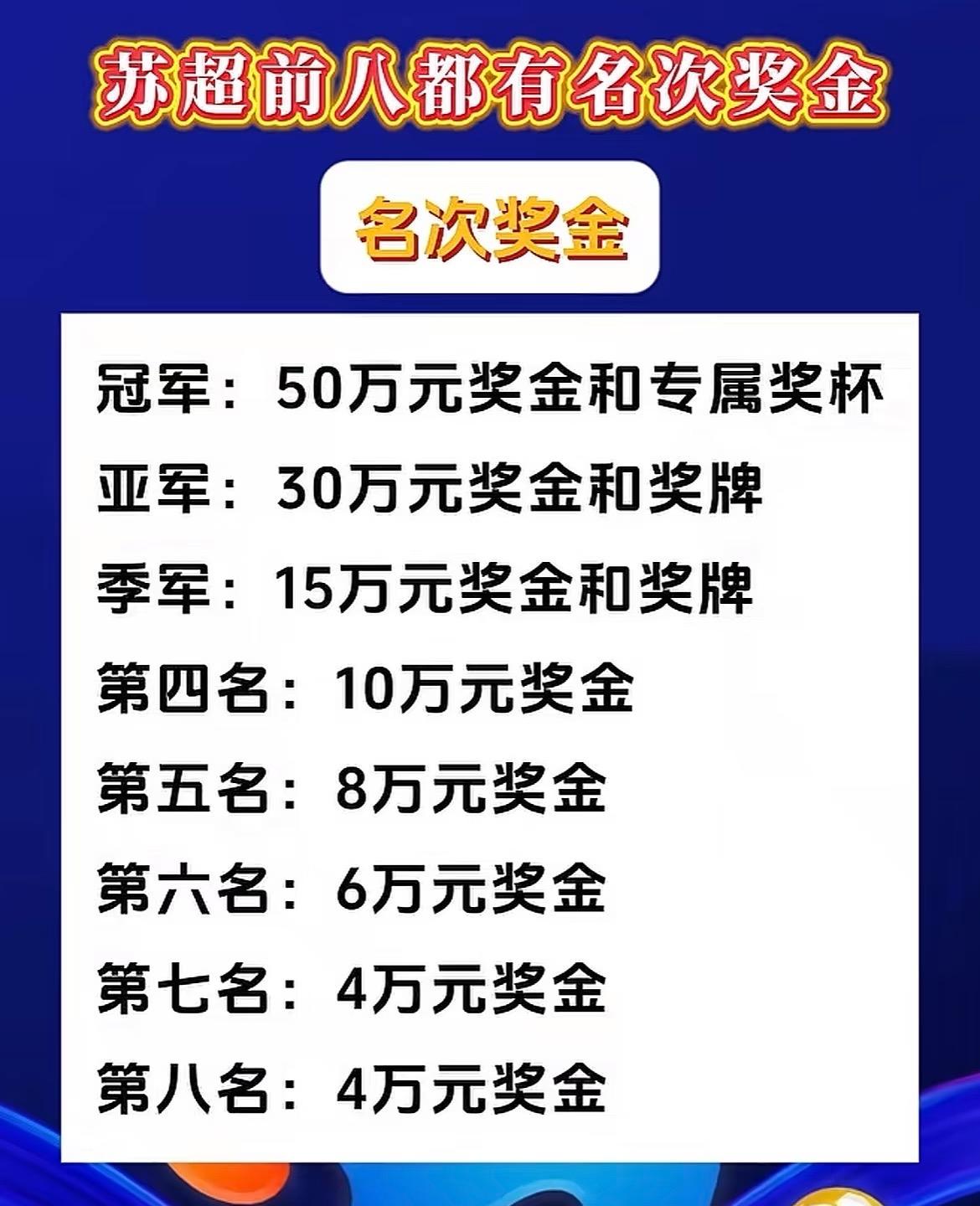 除了名次之外,苏超联赛也有奖金,早在上个月,江苏省体育局已经回应联赛冠军可以获得专属奖杯,亚季军分获奖牌,前八名均有名次奖金,并设最佳球员、教练等个人荣誉,还强调2026年赛事将继续举办。