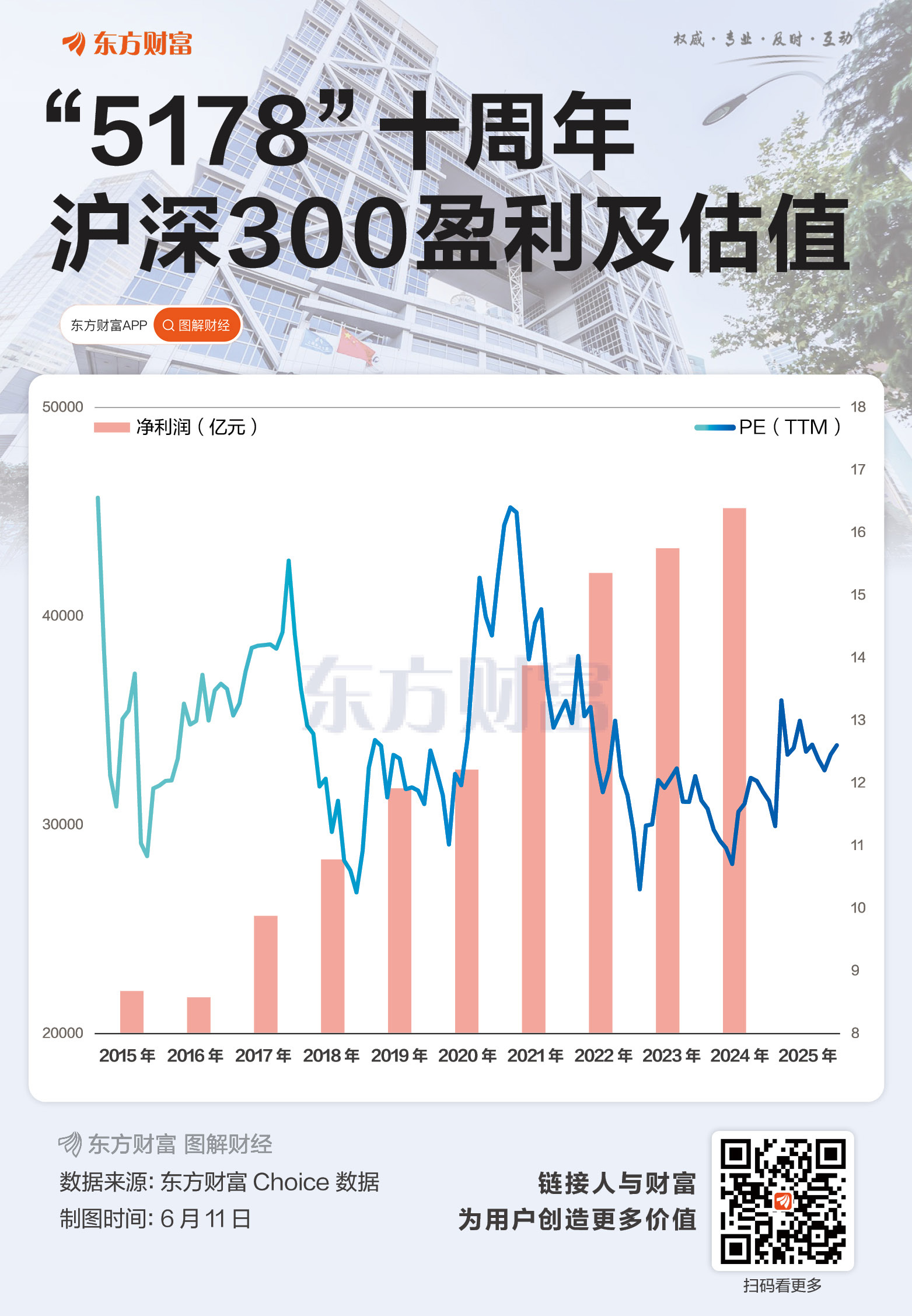 指数未能超越“5178”与A股估值回调有关。十年前,沪深300指数PE(TTM)为16.6倍,如今则为12.6倍。而沪深300成分股的净利润从2015年的2.2万亿元增加至2024年的4.51万亿元。